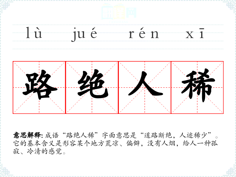 成语“路绝人稀”字面意思是“道路断绝,人迹稀少”。它的基本含义是形容某个地方荒凉、偏僻,没有人烟,给人一种孤寂、冷清的感觉。
