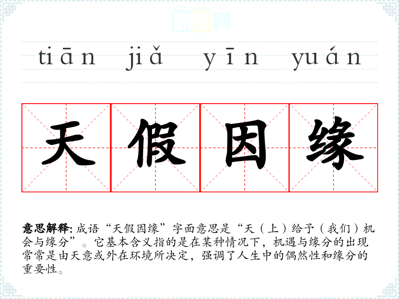 成语“天假因缘”字面意思是“天(上)给予(我们)机会与缘分”。它基本含义指的是在某种情况下,机遇与缘分的出现常常是由天意或外在环境所决定,强调了人生中的偶然性和缘分的重要性。