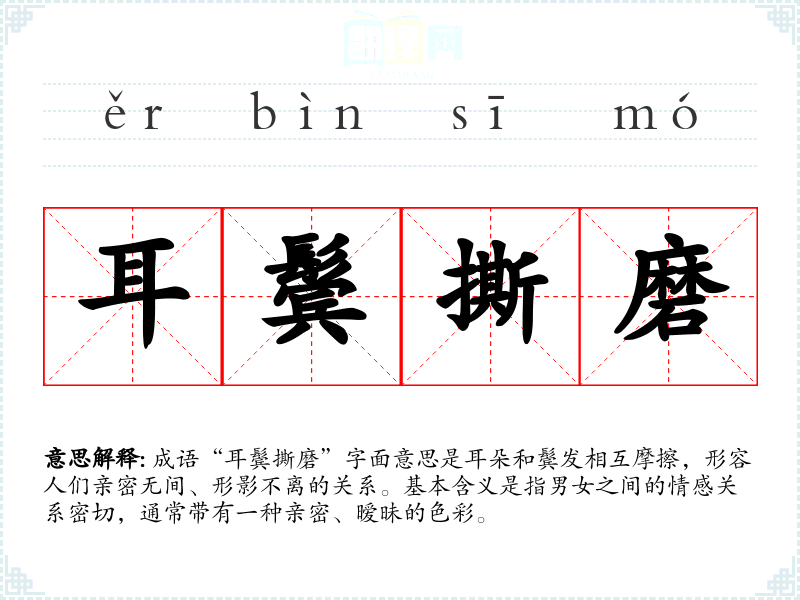 成语“耳鬓撕磨”字面意思是耳朵和鬓发相互摩擦,形容人们亲密无间、形影不离的关系。基本含义是指男女之间的情感关系密切,通常带有一种亲密、暧昧的色彩。