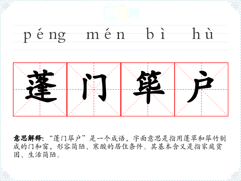 “蓬门筚户”是一个成语,字面意思是指用蓬草和筚竹制成的门和窗,形容简陋、寒酸的居住条件。其基本含义是指家庭贫困、生活简陋。