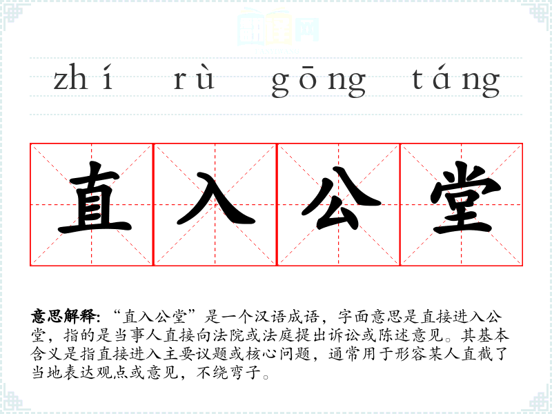 “直入公堂”是一个汉语成语,字面意思是直接进入公堂,指的是当事人直接向法院或法庭提出诉讼或陈述意见。其基本含义是指直接进入主要议题或核心问题,通常用于形容某人直截了当地表达观点或意见,不绕弯子。