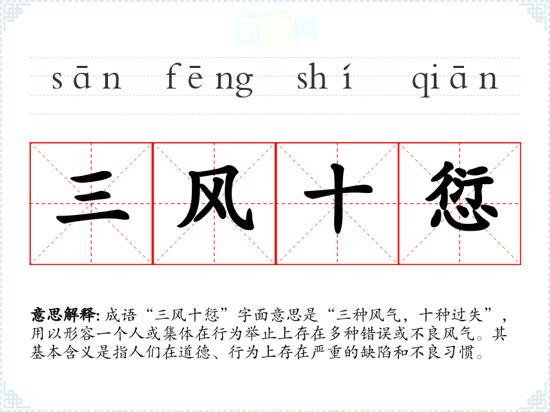 成语“三风十愆”字面意思是“三种风气,十种过失”,用以形容一个人或集体在行为举止上存在多种错误或不良风气。其基本含义是指人们在道德、行为上存在严重的缺陷和不良*惯。