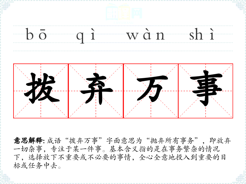 成语“拨弃万事”字面意思为“抛弃所有事务”,即放弃一切杂事,专注于某一件事。基本含义指的是在事务繁杂的情况下,选择放下不重要或不必要的事情,全心全意地投入到重要的目标或任务中去。