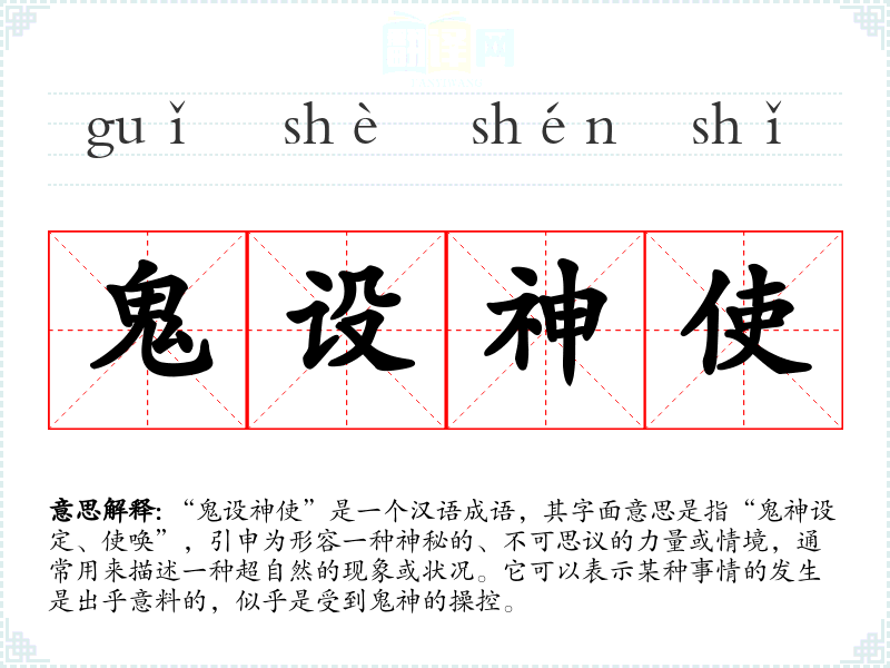 “鬼设神使”是一个汉语成语,其字面意思是指“鬼神设定、使唤”,引申为形容一种神秘的、不可思议的力量或情境,通常用来描述一种超自然的现象或状况。它可以表示某种事情的发生是出乎意料的,似乎是受到鬼神的操控。