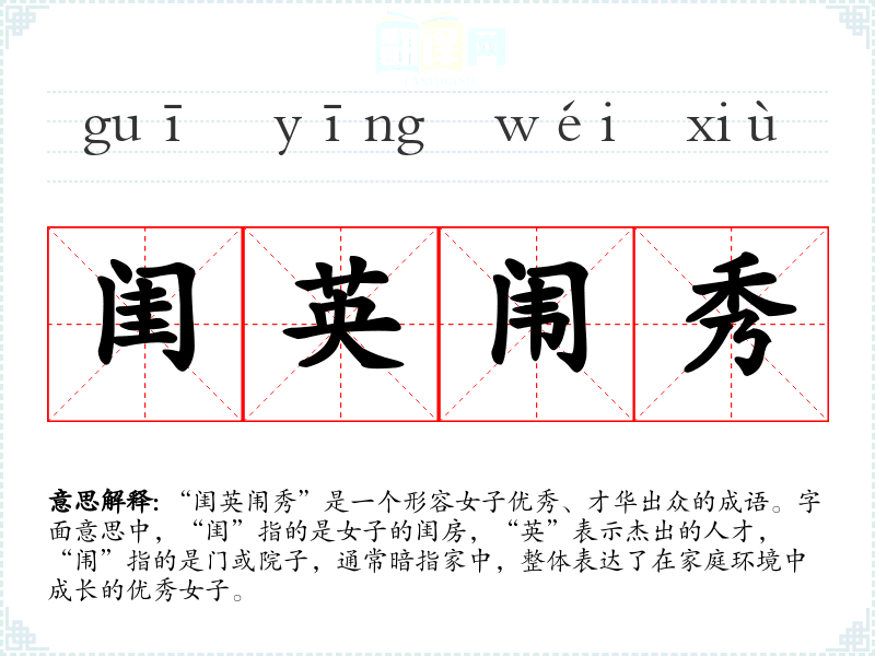“闺英闱秀”是一个形容女子优秀、才华出众的成语。字面意思中,“闺”指的是女子的闺房,“英”表示杰出的人才,“闱”指的是门或院子,通常暗指家中,整体表达了在家庭环境中成长的优秀女子。