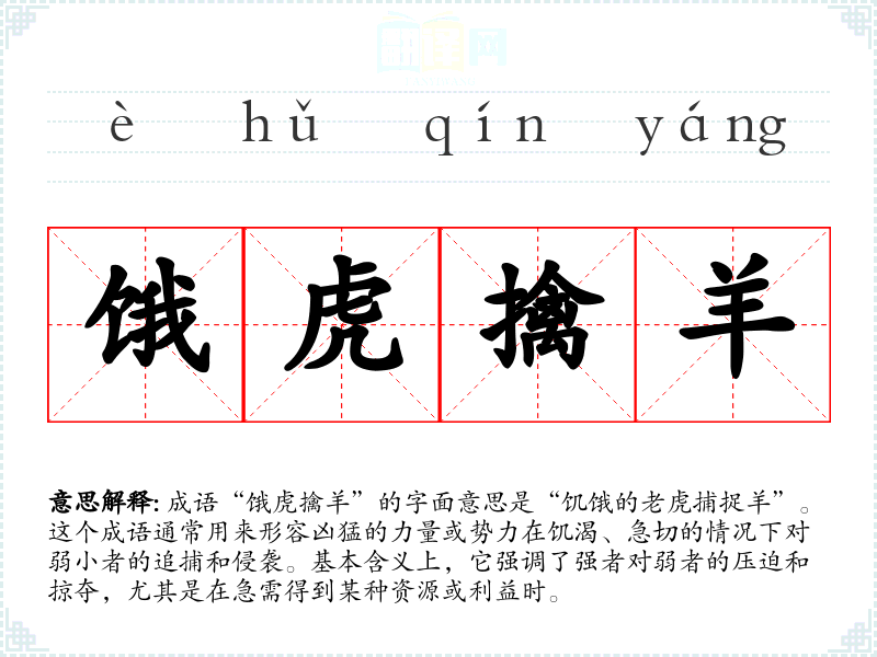 “饿虎擒羊”并非出自某一特定的古代文献,而是由“饿虎”和“擒羊”两个词语组合而成。在文化中被视为猛兽,象征着力量和威胁,而羊则代表着柔弱和无助。在历史上,**常常被用作比喻,形容强者对弱者的捕猎。