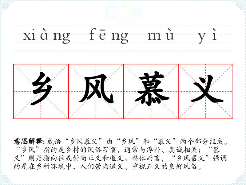 成语“乡风慕义”由“乡风”和“慕义”两个部分组成。“乡风”指的是乡村的风俗*惯,通常与淳朴、真诚相关;“慕义”则是指向往或崇尚正义和道义。整体而言,“乡风慕义”强调的是在乡村环境中,人们崇尚道义、重视正义的良好风俗。