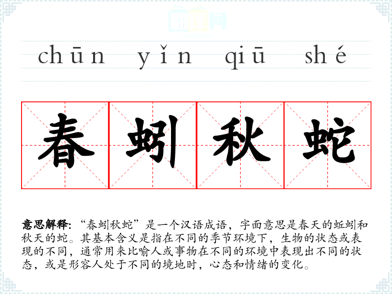 “春蚓秋蛇”是一个汉语成语,字面意思是春天的蚯蚓和秋天的蛇。其基本含义是指在不同的季节环境下,生物的状态或表现的不同,通常用来比喻人或事物在不同的环境中表现出不同的状态,或是形容人处于不同的境地时,心态和情绪的变化。