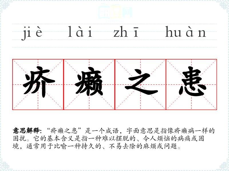 “疥癞之患”是一个成语,字面意思是指像疥癞病一样的困扰。它的基本含义是指一种难以摆脱的、令人烦恼的病痛或困境,通常用于比喻一种持久的、不易去除的麻烦或问题。