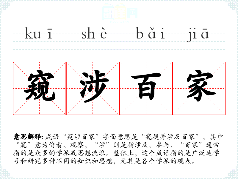 成语“窥涉百家”字面意思是“窥视并涉及百家”,其中“窥”意为偷看、观察,“涉”则是指涉及、参与,“百家”通常指的是众多的学派或思想流派。整体上,这个成语指的是广泛地学*和研究多种不同的知识和思想,尤其是各个学派的观点。
