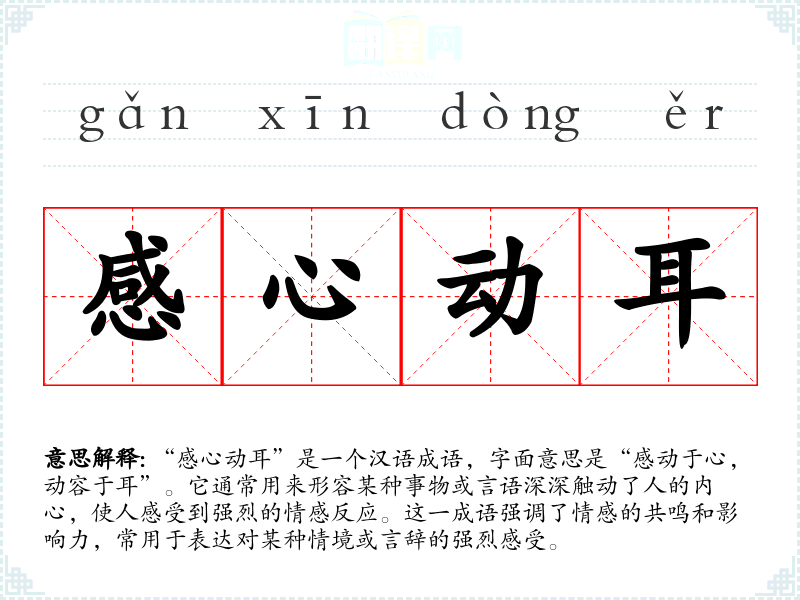 “感心动耳”并没有一个明确的典故或历史来源,但它的构成可以看作是对人的情感反应的描写,符合汉语成语通常以情感、心理活动为主题的特点。成语中的“感心”代表心灵的感动,“动耳”则指听觉上的触动,二者结合反映了内心与外界信息的相互作用。