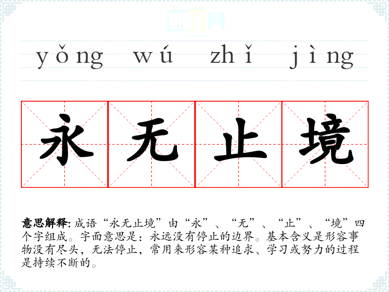 成语“永无止境”由“永”、“无”、“止”、“境”四个字组成。字面意思是:永远没有停止的边界。基本含义是形容事物没有尽头,无法停止,常用来形容某种追求、学*或努力的过程是持续不断的。