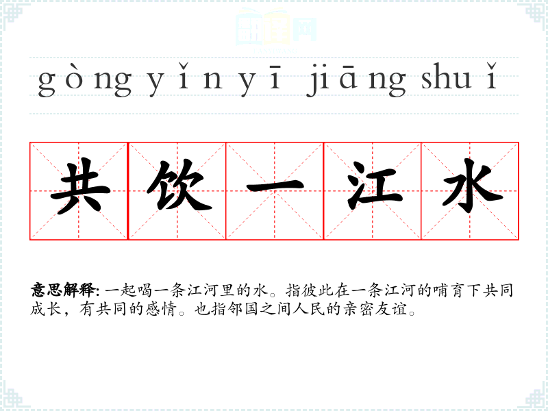 | 共饮一江水 | 一起喝一条江河里的水。指彼此在一条江河的哺育下共同成长,有共同的感情。也指邻国之间人民的亲密友谊。 |