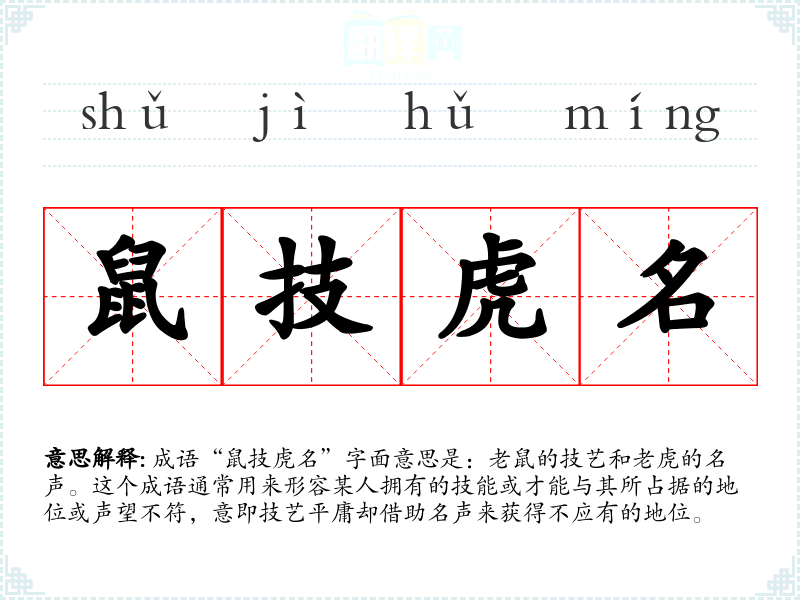 成语“鼠技虎名”字面意思是:老鼠的技艺和**的名声。这个成语通常用来形容某人拥有的技能或才能与其所占据的地位或声望不符,意即技艺平庸却借助名声来获得不应有的地位。
