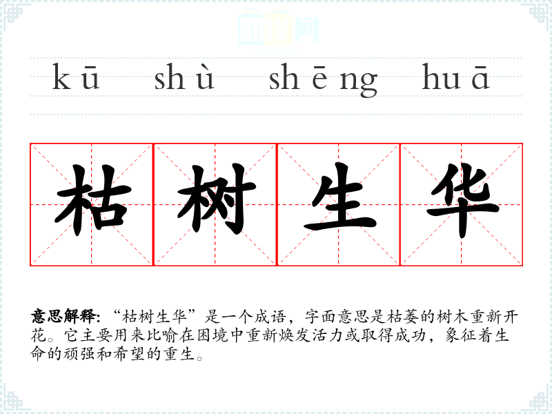 - 日常对话:朋友失业后重新找到工作时,可以说:“就像枯树生华,你的努力终于得到了回报。”