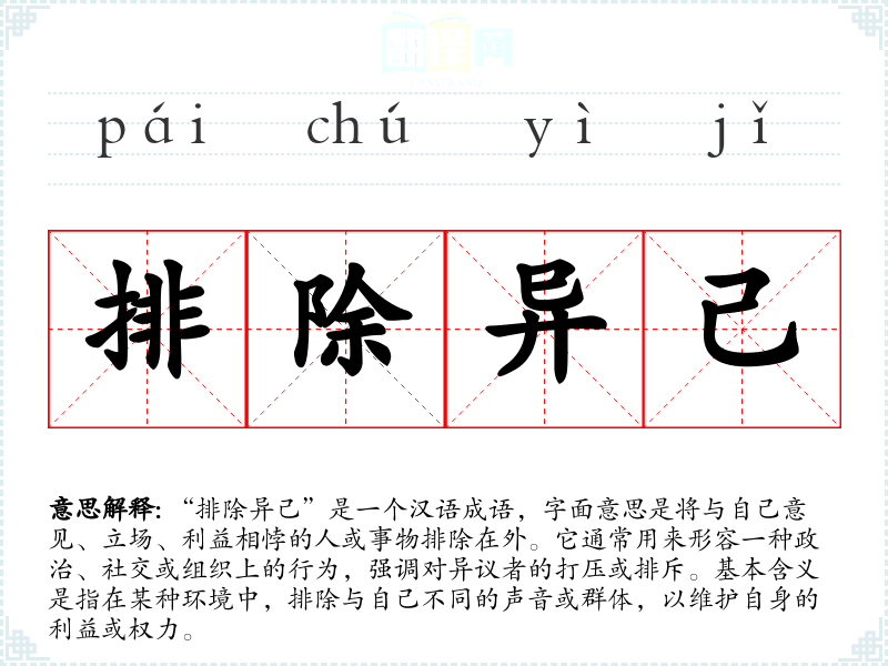 “****”是一个汉语成语,字面意思是将与自己意见、立场、利益相悖的人或事物排除在外。它通常用来形容一种政治、社交或组织上的行为,强调对异议者的打压或排斥。基本含义是指在某种环境中,排除与自己不同的声音或群体,以维护自身的利益或权力。