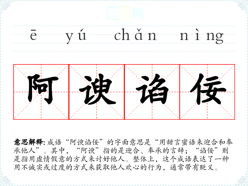 成语“阿谀谄佞”的字面意思是“用甜言蜜语来迎合和奉承他人”。其中,“阿谀”指的是迎合、奉承的言辞;“谄佞”则是指用虚情假意的方式来讨好他人。整体上,这个成语表达了一种用不诚实或过度的方式来获取他人欢心的行为,通常带有贬义。