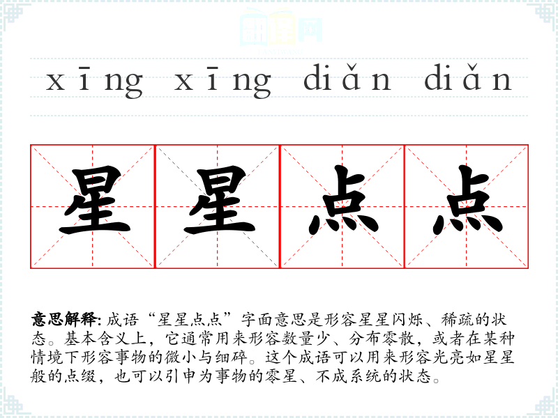 成语“星星点点”字面意思是形容星星闪烁、稀疏的状态。基本含义上,它通常用来形容数量少、分布零散,或者在某种情境下形容事物的微小与细碎。这个成语可以用来形容光亮如星星般的点缀,也可以引申为事物的零星、不成系统的状态。