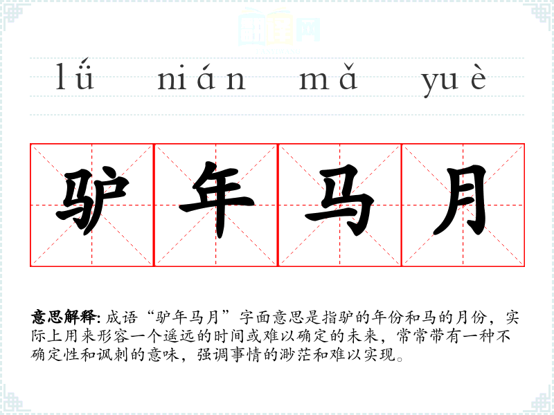 成语“驴年马月”字面意思是指驴的年份和马的月份,实际上用来形容一个遥远的时间或难以确定的未来,常常带有一种不确定性和讽刺的意味,强调事情的渺茫和难以实现。