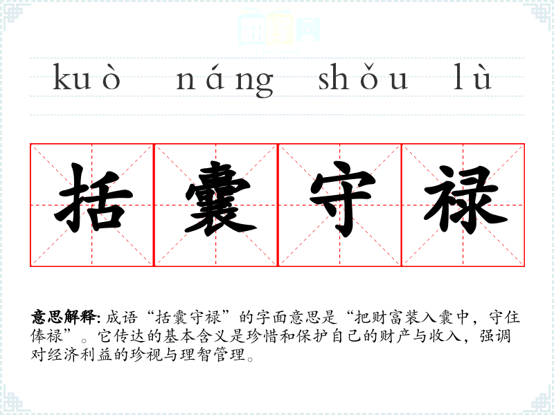 成语“括囊守禄”的字面意思是“把财富装入囊中,守住俸禄”。它传达的基本含义是珍惜和保护自己的财产与收入,强调对经济利益的珍视与理智管理。