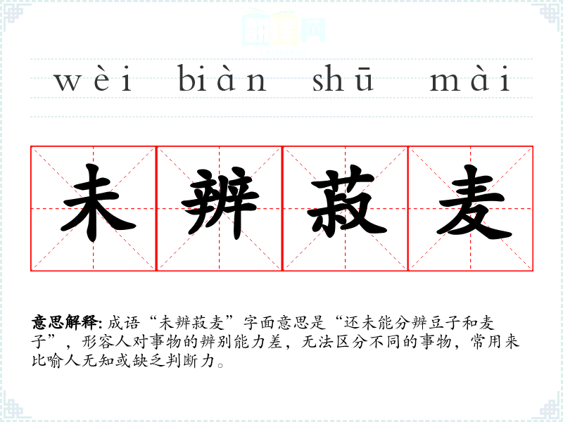 成语“未辨菽麦”字面意思是“还未能分辨豆子和麦子”,形容人对事物的辨别能力差,无法区分不同的事物,常用来比喻人无知或缺乏判断力。