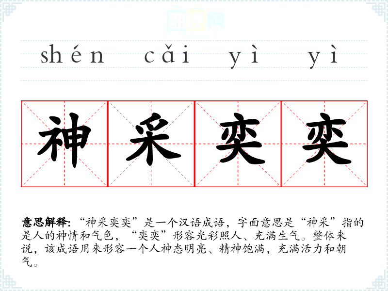 “神采奕奕”是一个汉语成语,字面意思是“神采”指的是人的神情和气色,“奕奕”形容光彩照人、充满生气。整体来说,该成语用来形容一个人神态明亮、精神饱满,充满活力和朝气。