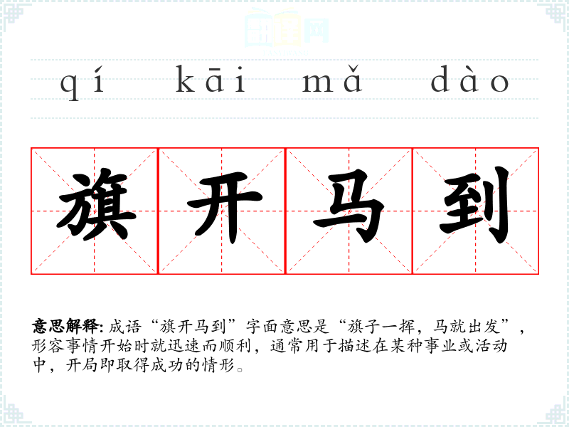 成语“旗开马到”字面意思是“旗子一挥,马就出发”,形容事情开始时就迅速而顺利,通常用于描述在某种事业或活动中,开局即取得成功的情形。