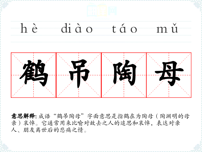 成语“鹤吊陶母”字面意思是指鹤在为陶母(陶渊明的母亲)哀悼。它通常用来比喻对故去之人的追思和哀悼,表达对亲人、朋友离世后的悲痛之情。