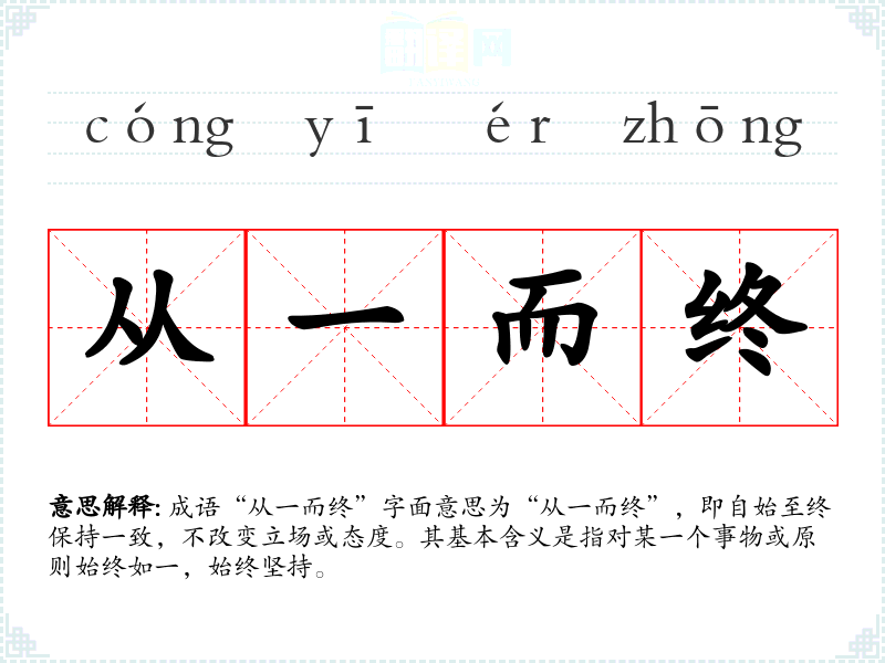 成语“从一而终”字面意思为“从一而终”,即自始至终保持一致,不改变立场或态度。其基本含义是指对某一个事物或原则始终如一,始终坚持。