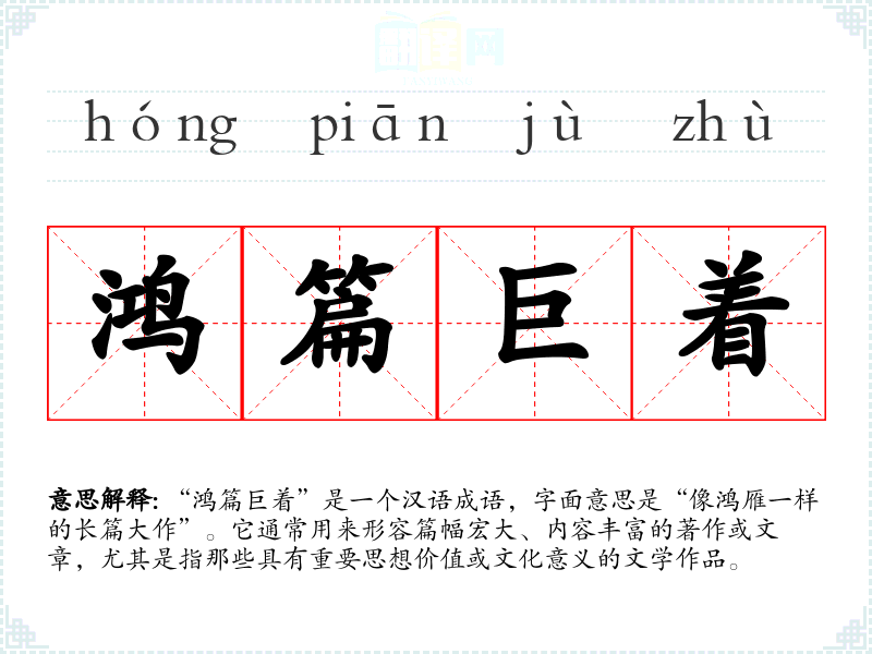 “鸿篇巨着”是一个汉语成语,字面意思是“像鸿雁一样的长篇大作”。它通常用来形容篇幅宏大、内容丰富的著作或文章,尤其是指那些具有重要思想价值或文化意义的文学作品。