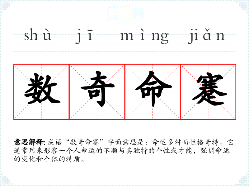 成语“数奇命蹇”字面意思是:命运多舛而性格奇特。它通常用来形容一个人命运的不顺与其独特的个性或才能,强调命运的变化和个体的特质。