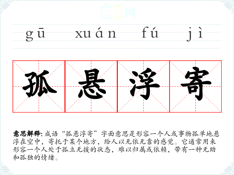 成语“孤悬浮寄”字面意思是形容一个人或事物孤单地悬浮在空中,寄托于某个地方,给人以无依无靠的感觉。它通常用来形容一个人处于孤立无援的状态,难以归属或依赖,带有一种无助和孤独的情绪。