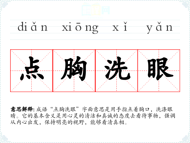 成语“点胸洗眼”字面意思是用手指点着胸口,洗涤眼睛。它的基本含义是用心灵的清洁和真诚的态度去看待事物,强调从内心出发,保持明亮的视野,能够看清真相。