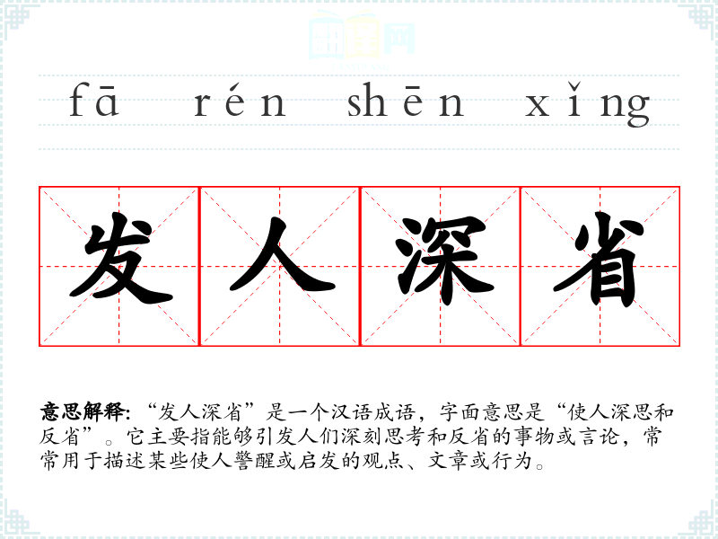 “发人深省”是一个汉语成语,字面意思是“使人深思和反省”。它主要指能够引发人们深刻思考和反省的事物或言论,常常用于描述某些使人警醒或启发的观点、文章或行为。