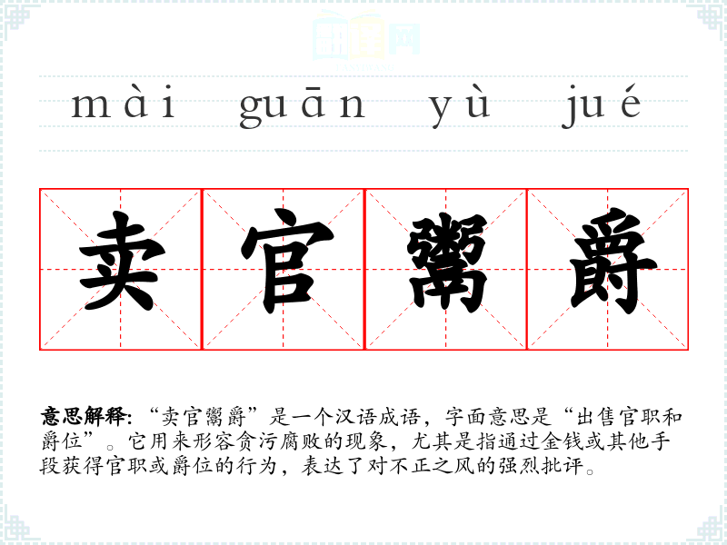“卖官鬻爵”是一个汉语成语,字面意思是“出售官职和爵位”。它用来形容贪污腐败的现象,尤其是指通过金钱或其他手段获得官职或爵位的行为,表达了对不正之风的强烈批评。