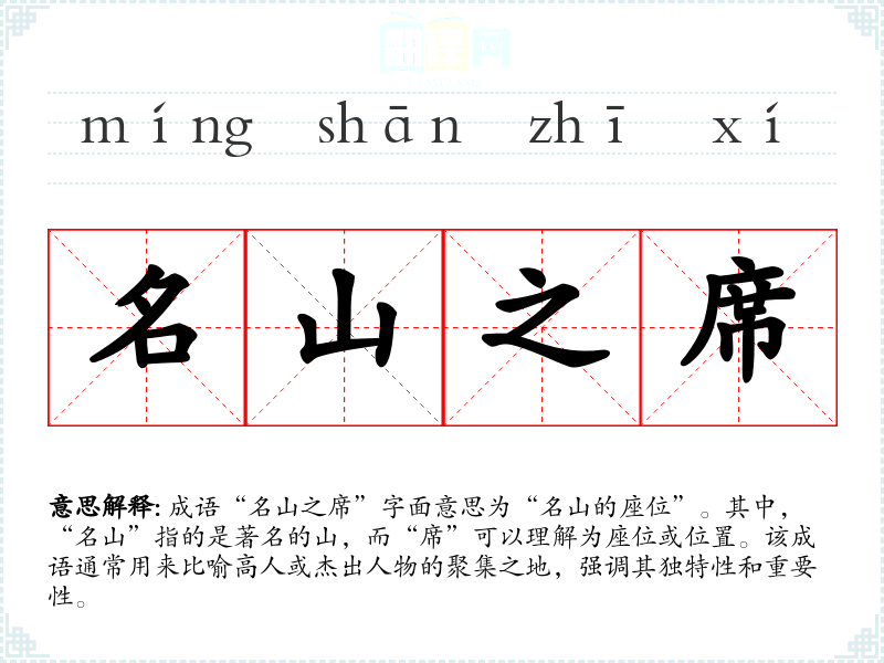 成语“名山之席”字面意思为“名山的座位”。其中,“名山”指的是著名的山,而“席”可以理解为座位或位置。该成语通常用来比喻高人或杰出人物的聚集之地,强调其独特性和重要性。