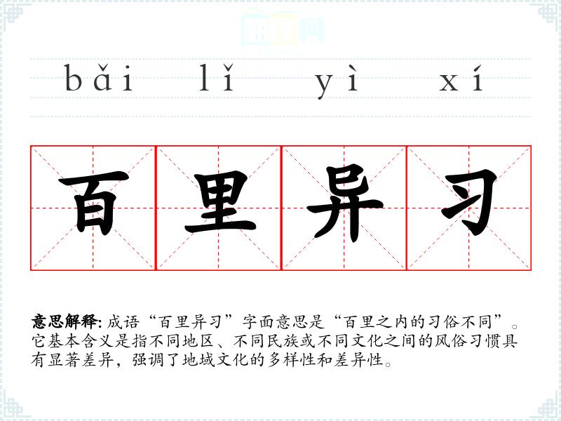 成语“百里异”字面意思是“百里之内的俗不同”。它基本含义是指不同地区、不同民族或不同文化之间的风俗*惯具有显著差异,强调了地域文化的多样性和差异性。