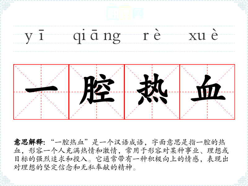 “一腔热血”是一个汉语成语,字面意思是指一腔的热血,形容一个人充满热情和激情,常用于形容对某种事业、理想或目标的强烈追求和投入。它通常带有一种积极向上的情感,表现出对理想的坚定信念和无私奉献的精神。