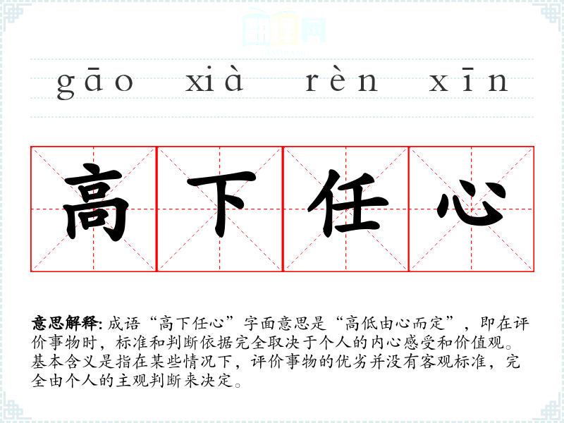 成语“高下任心”字面意思是“高低由心而定”,即在评价事物时,标准和判断依据完全取决于个人的内心感受和价值观。基本含义是指在某些情况下,评价事物的优劣并没有客观标准,完全由个人的主观判断来决定。