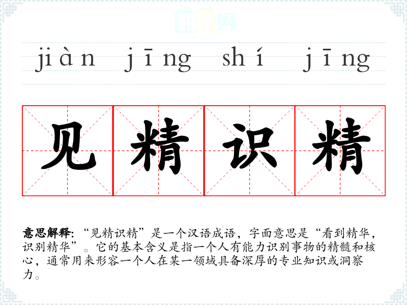 “见精识精”是一个汉语成语,字面意思是“看到精华,识别精华”。它的基本含义是指一个人有能力识别事物的精髓和核心,通常用来形容一个人在某一领域具备深厚的专业知识或洞察力。