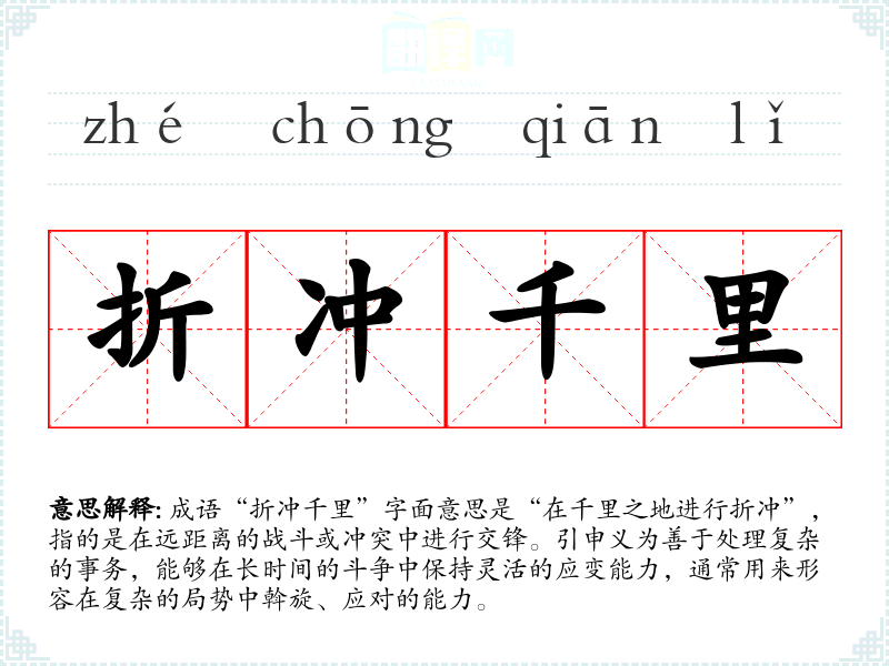 成语“折冲千里”字面意思是“在千里之地进行折冲”,指的是在远距离的战斗或冲突中进行交锋。引申义为善于处理复杂的事务,能够在长时间的斗争中保持灵活的应变能力,通常用来形容在复杂的局势中斡旋、应对的能力。