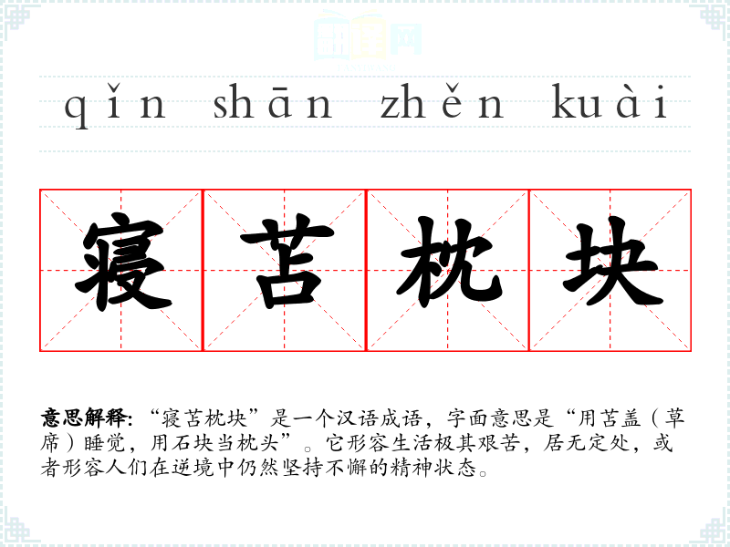 “寝苫枕块”是一个汉语成语,字面意思是“用苫盖(草席)睡觉,用石块当枕头”。它形容生活极其艰苦,居无定处,或者形容人们在逆境中仍然坚持不懈的精神状态。