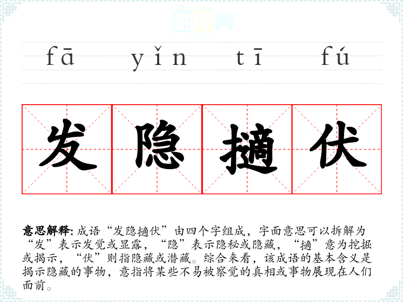 成语“发隐擿伏”由四个字组成,字面意思可以拆解为“发”表示发觉或显露,“隐”表示隐秘或隐藏,“擿”意为挖掘或揭示,“伏”则指隐藏或潜藏。综合来看,该成语的基本含义是揭示隐藏的事物,意指将某些不易被察觉的真相或事物展现在人们面前。
