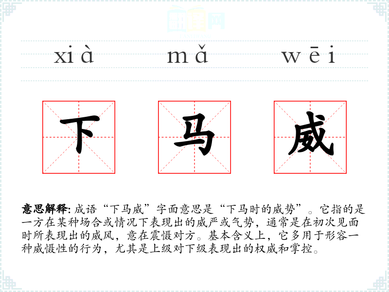成语“下马威”字面意思是“下马时的威势”。它指的是一方在某种场合或情况下表现出的威严或气势,通常是在初次见面时所表现出的威风,意在震慑对方。基本含义上,它多用于形容一种威慑性的行为,尤其是上级对下级表现出的权威和掌控。