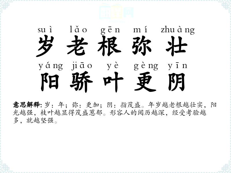 岁:年;弥:更加;阴:指茂盛。年岁越老根越壮实,阳光越强,枝叶越显得茂盛葱郁。形容人的阅历越深,经受考验越多,就越坚强。 |