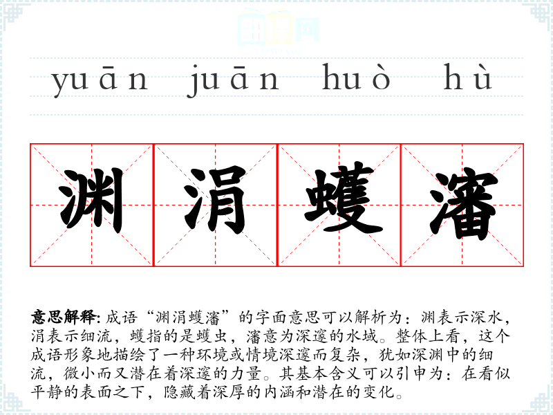 成语“渊涓蠖瀋”的字面意思可以解析为:渊表示深水,涓表示细流,蠖指的是蠖虫,瀋意为深邃的水域。整体上看,这个成语形象地描绘了一种环境或情境深邃而复杂,犹如深渊中的细流,微小而又潜在着深邃的力量。其基本含义可以引申为:在看似平静的表面之下,隐藏着深厚的内涵和潜在的变化。