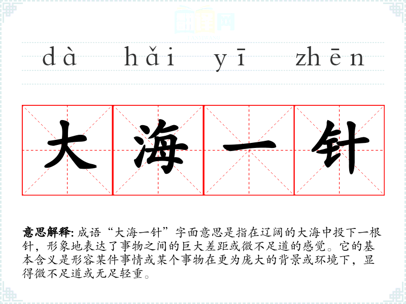 成语“大海一针”字面意思是指在辽阔的大海中投下一根针,形象地表达了事物之间的巨大差距或微不足道的感觉。它的基本含义是形容某件事情或某个事物在更为庞大的背景或环境下,显得微不足道或无足轻重。