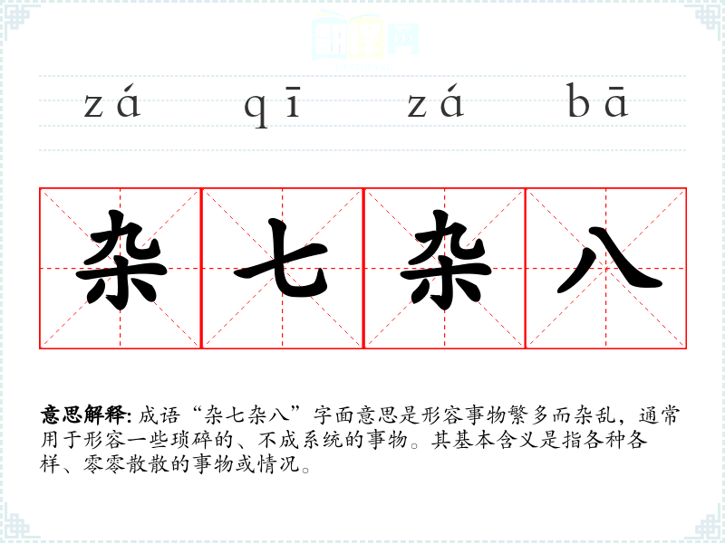 成语“杂七杂八”字面意思是形容事物繁多而杂乱,通常用于形容一些琐碎的、不成系统的事物。其基本含义是指各种各样、零零散散的事物或情况。