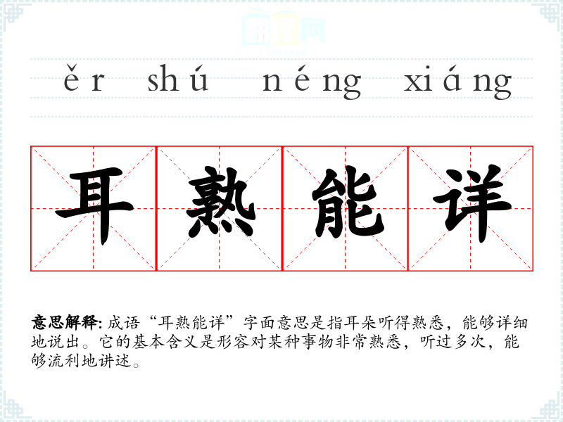 成语“耳熟能详”字面意思是指耳朵听得熟悉,能够详细地说出。它的基本含义是形容对某种事物非常熟悉,听过多次,能够流利地讲述。