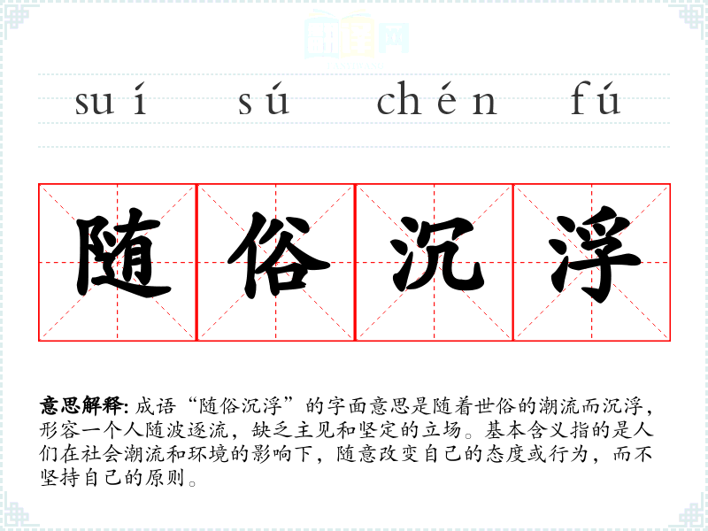 成语“随俗沉浮”的字面意思是随着世俗的潮流而沉浮,形容一个人随波逐流,缺乏主见和坚定的立场。基本含义指的是人们在社会潮流和环境的影响下,随意改变自己的态度或行为,而不坚持自己的原则。